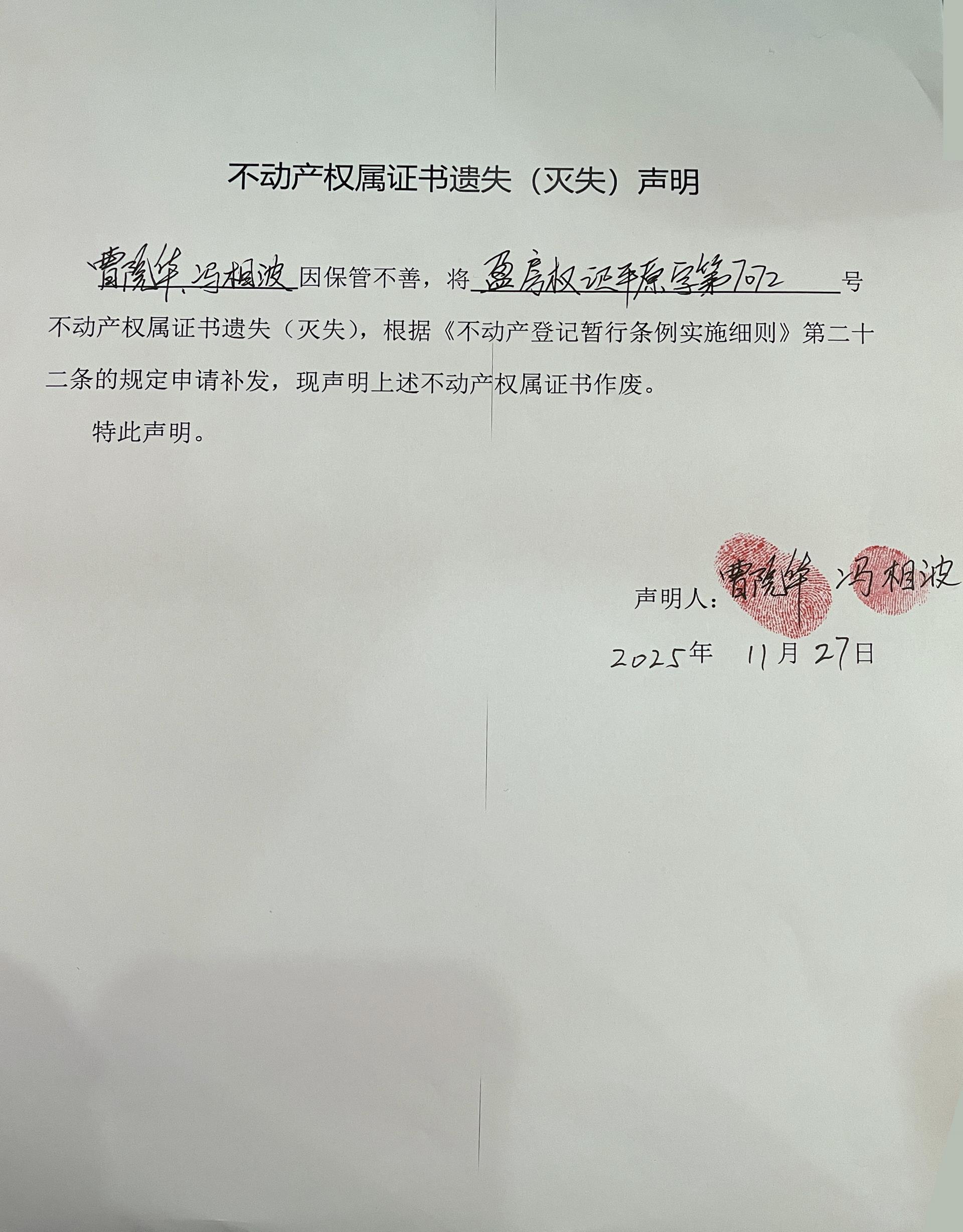 不动产权属证书遗失(灭失)声明(雷院华、冯相波)