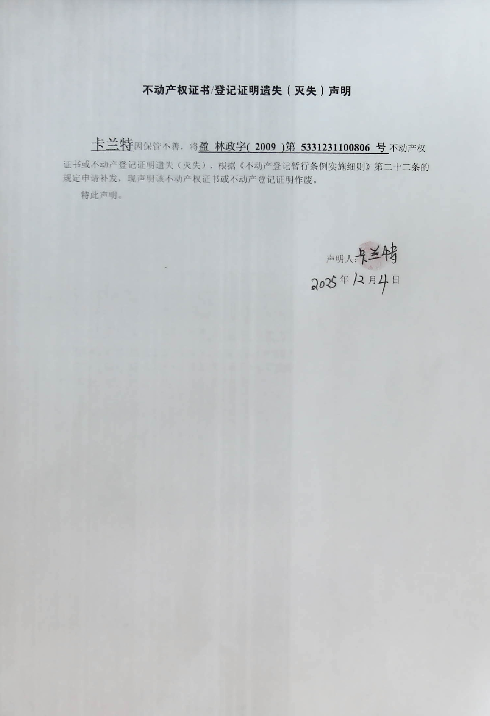 不动产登记证明遗失(灭失)声明(卡兰特)