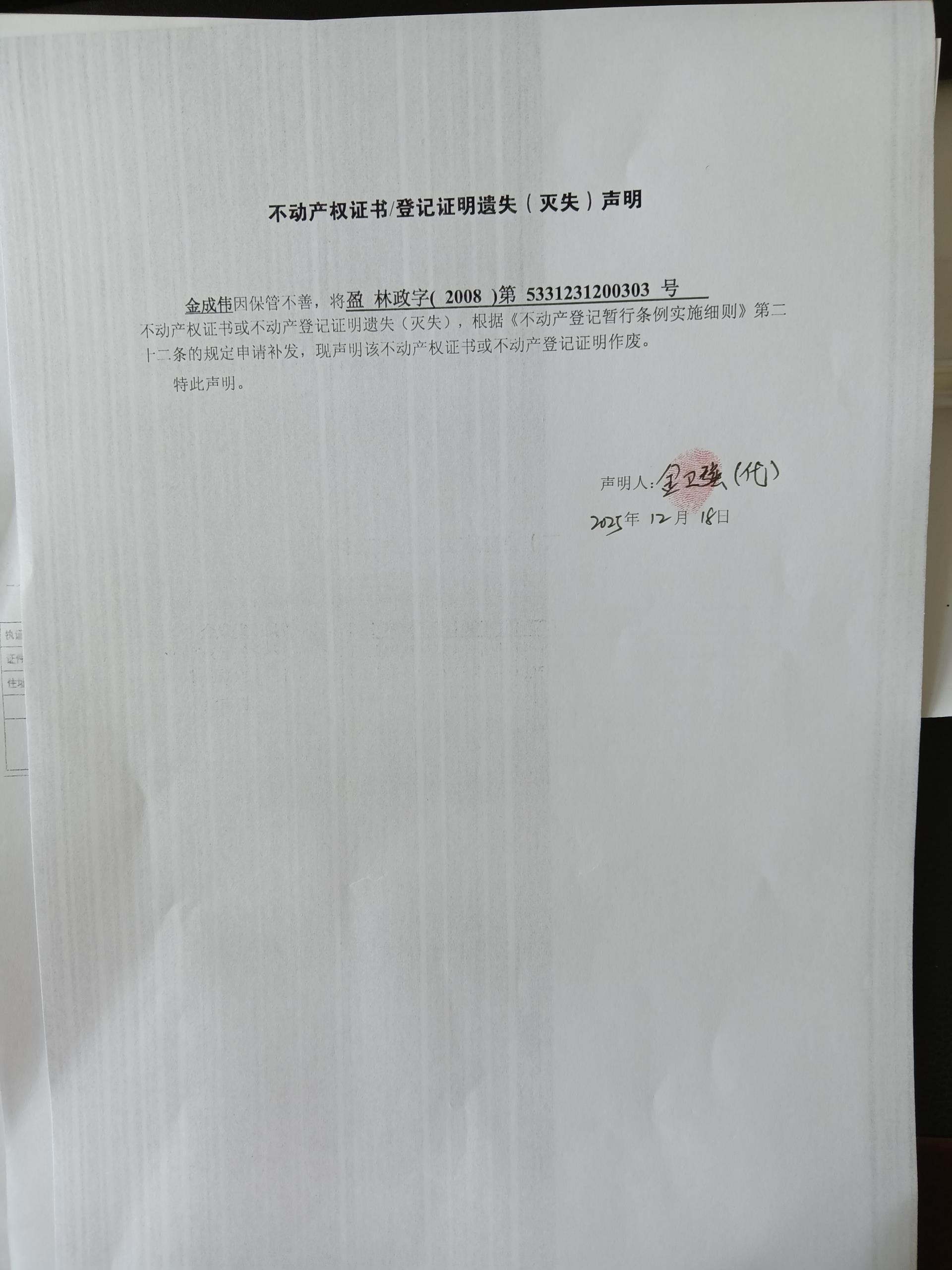 不动产权证书/登记证明遗失(灭失)声明(金成伟)