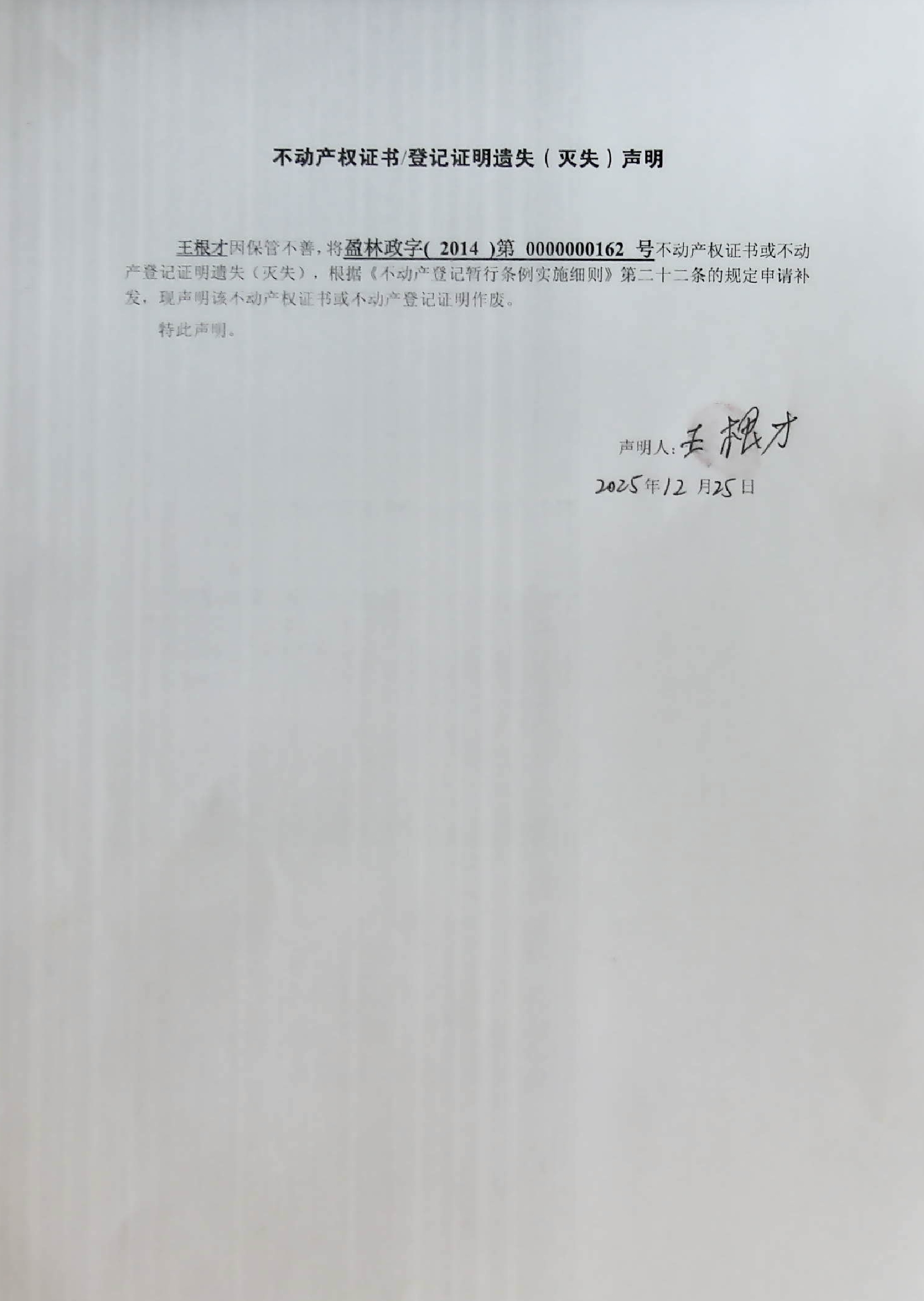 不动产权证书/登记证明遗失(灭失)声明(王根才)