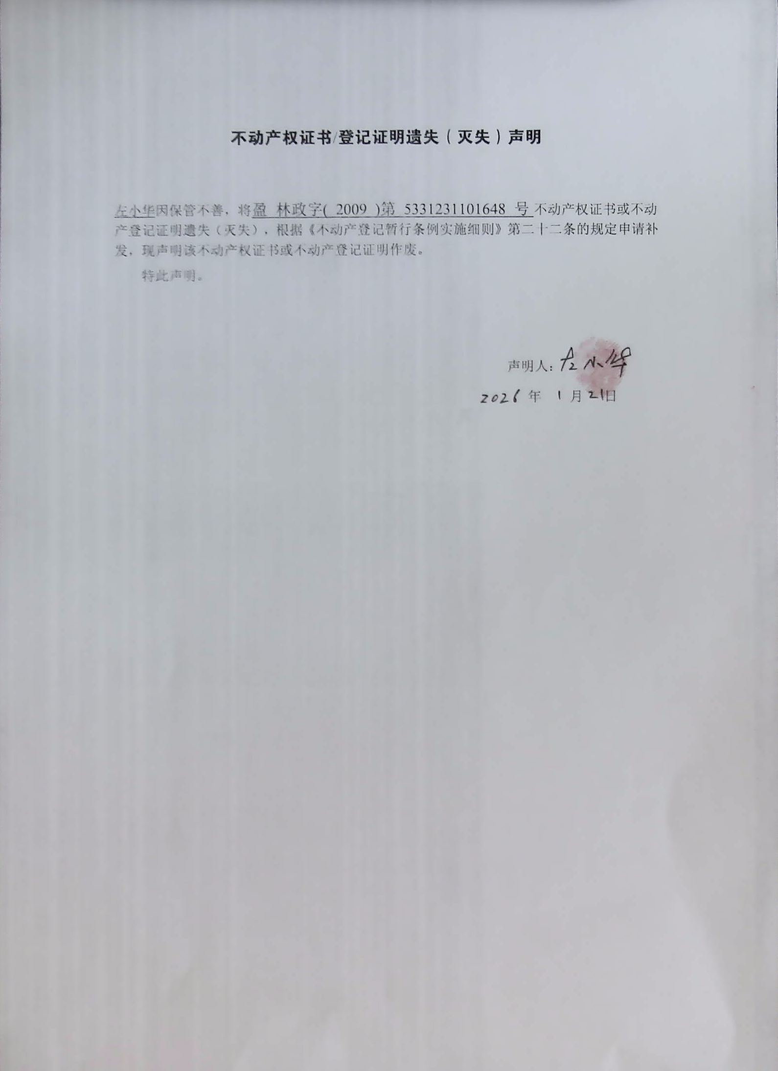不动产权证书/登记证明遗失(灭失)声明(左小华)