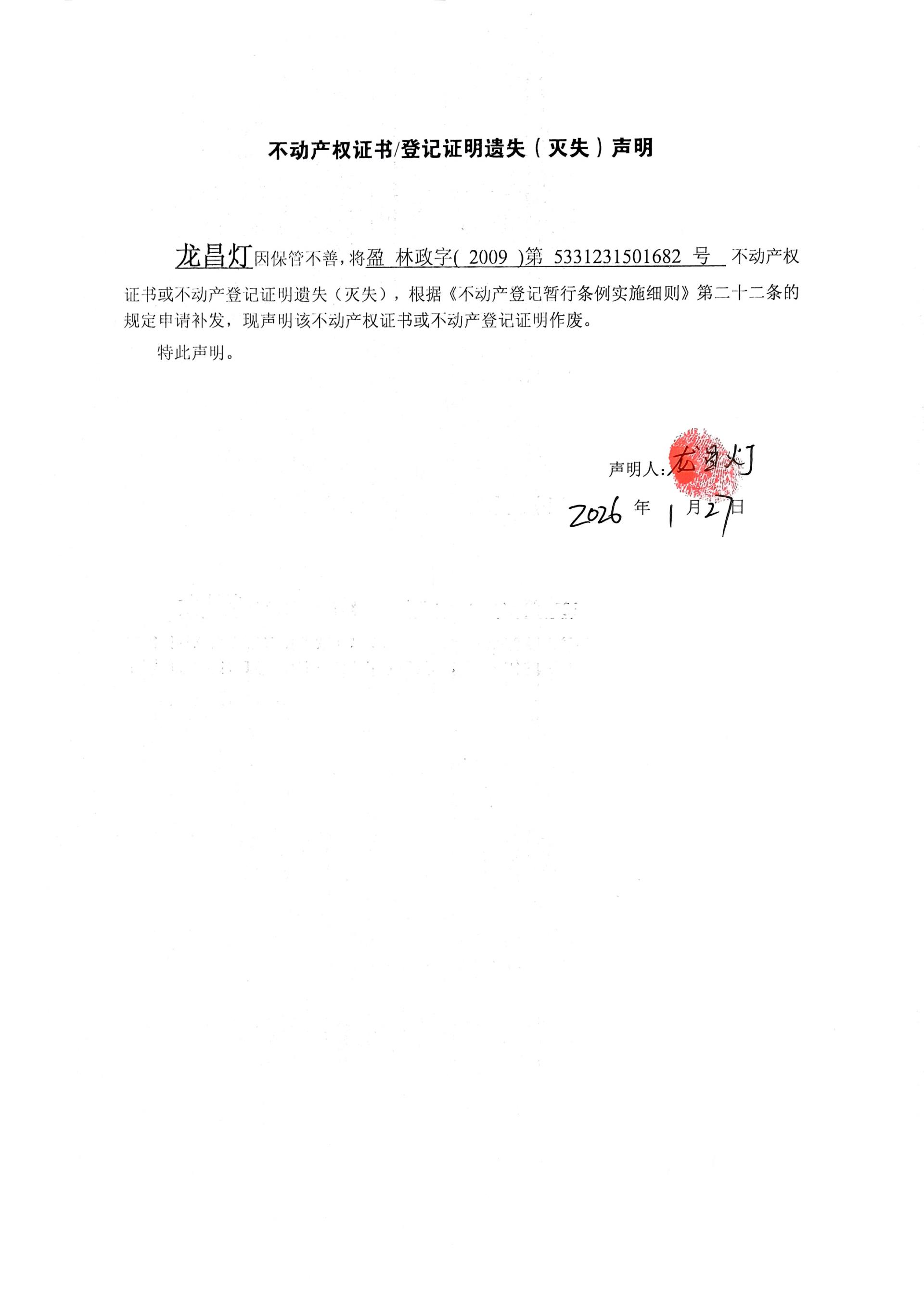 不动产权证书/登记证明遗失(灭失)声明(龙昌灯)