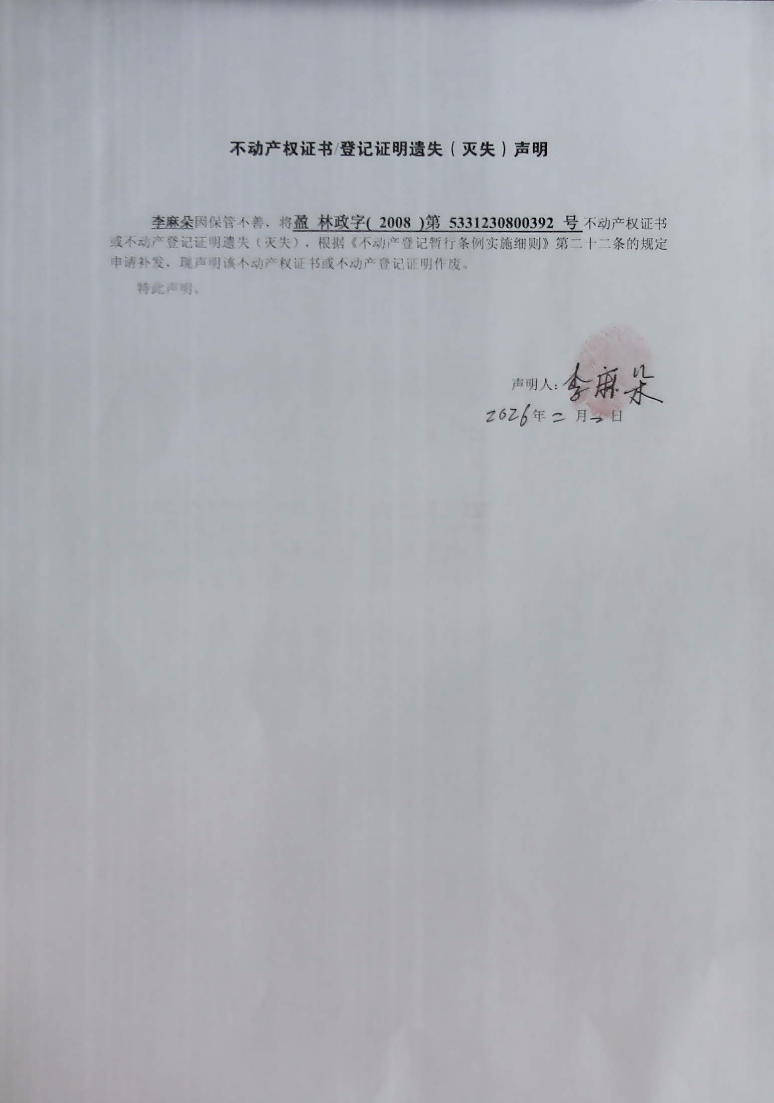 不动产权证书/登记证明遗失(灭失)声明(李麻朵)