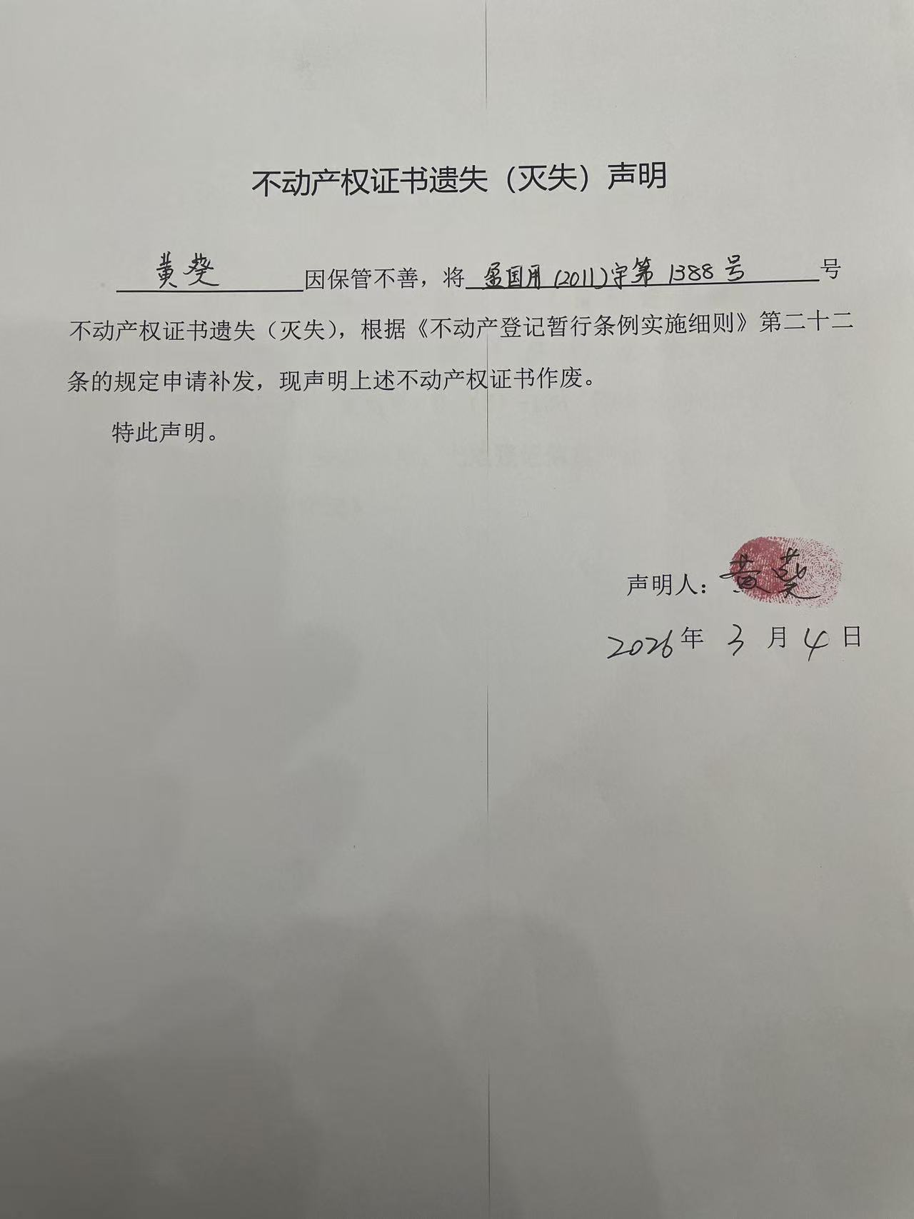 不动产权证书/登记证明遗失(灭失)声明(黄葵)