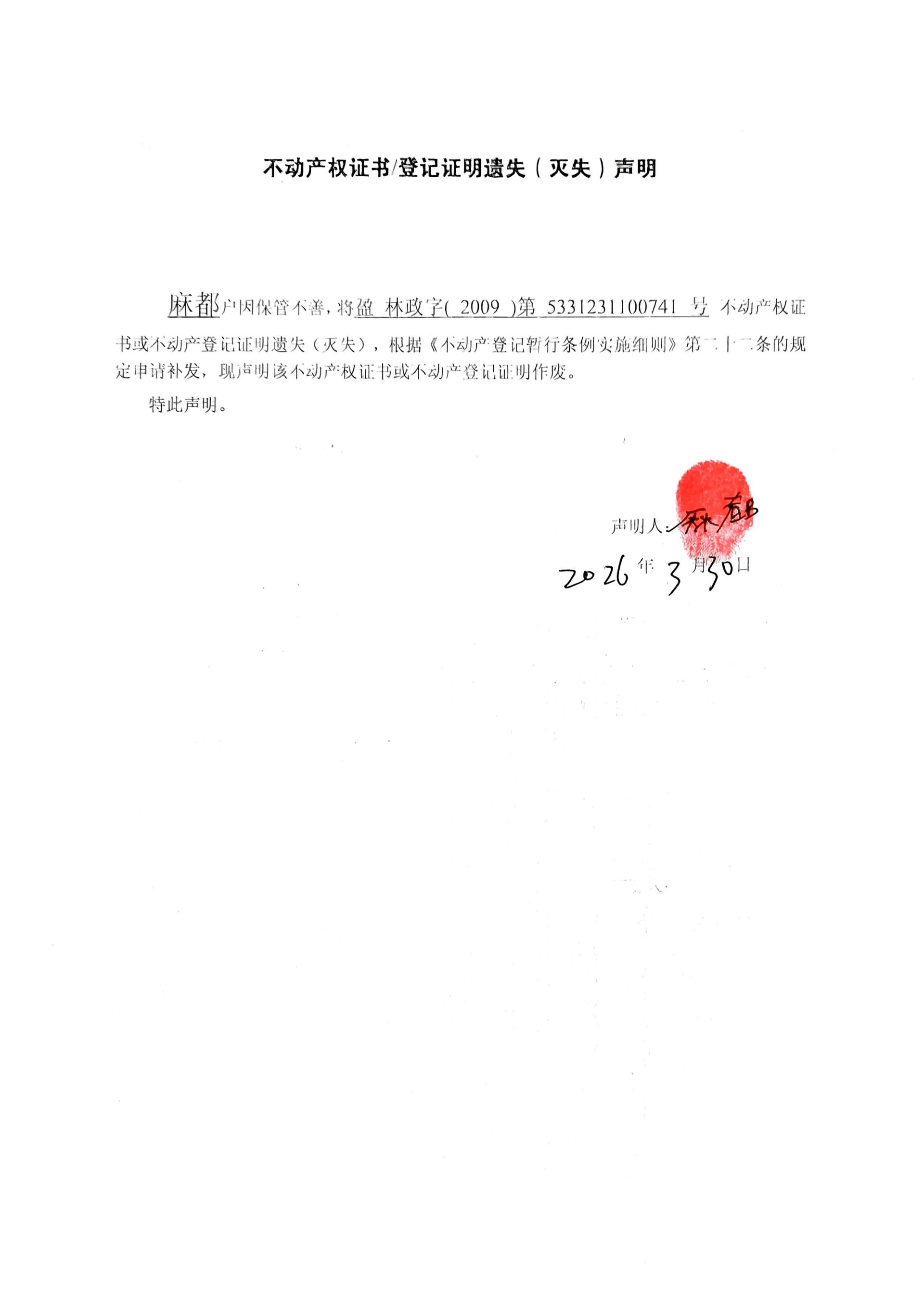 不动产权证书/登记证明遗失(灭失)声明(麻都)