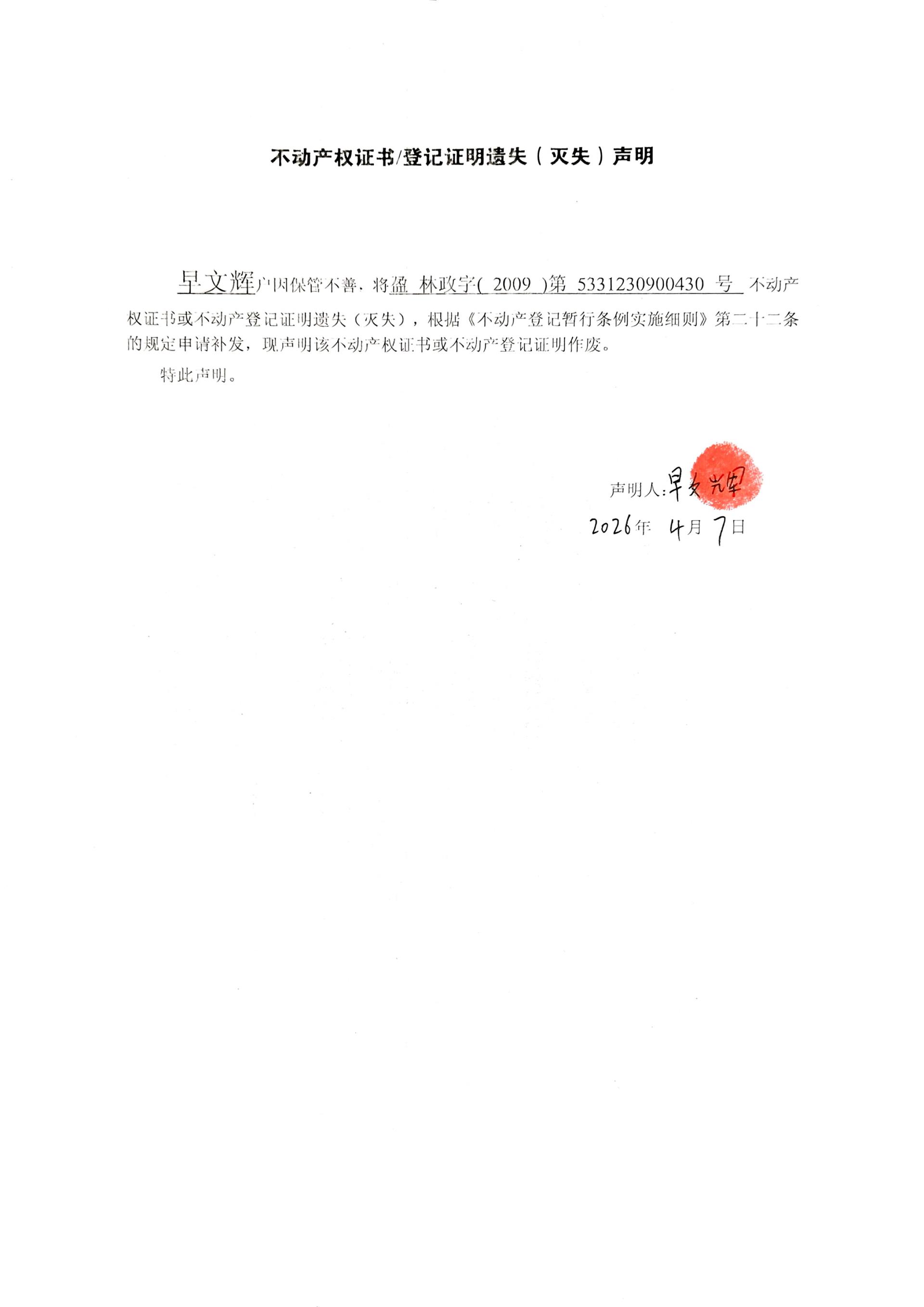 不动产权证书/登记证明遗失(灭失)声明(早文辉)