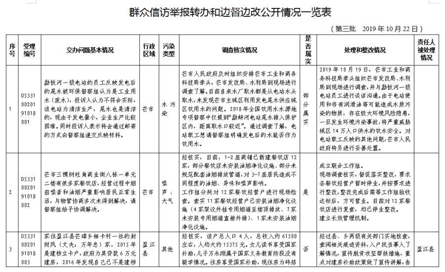 目前,省第四生态环境保护督察组第三批转办件已办结,其他批次环境问题举报件均及时转交有关县(市)和部门办理,正按有关要求进行办理。