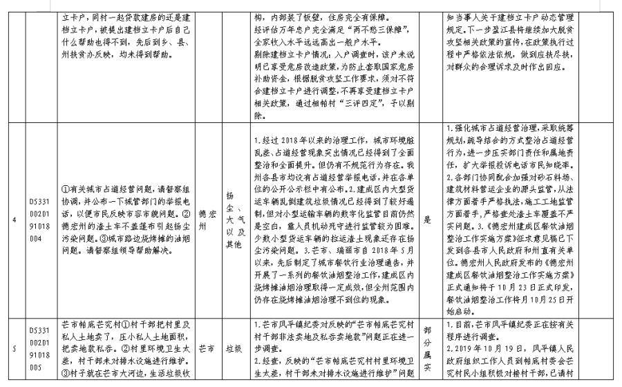 2019年10月15日-22日,德宏州共接收省委、省政府第四生态环境保护督察组六批次转办环境问题举报件35件(来电举报问题27件,来信举报问题8件),涉及全州共性问题2件,芒市20件、瑞丽市5件、盈江县4件、梁河县2件、陇川县2件。交办的举报件涉及固废污染5件、噪声污染10件、大气污染9件、水污染2件、其他问题9件(部分举报件含多项污染类型)。
