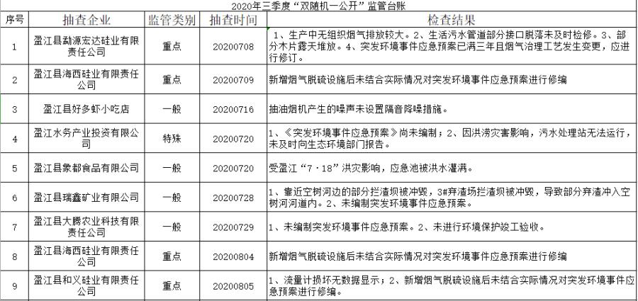 德宏州生态环境局盈江分局2020年4月环境监察双随机抽查结果公开表