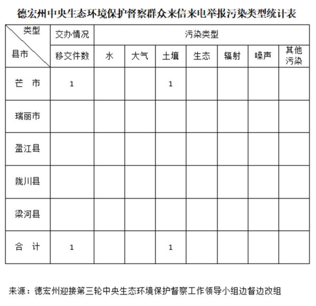2024年5月12日,中央第七生态环境保护督察组向云南移交第三批群众信访举报件79件,其中涉及德宏州1件。举报件已及时转交相关县(市)处理。