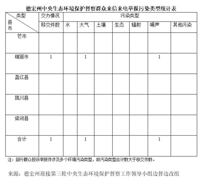 2024年5月19日,中央第七生态环境保护督察组向云南移交第十批群众信访举报件94件,其中涉及德宏州1件。截至当日,德宏共收到中央第七生态环境保护督察组交办的信访举报件9件,所有举报件均已及时转交相关县(市)处理。