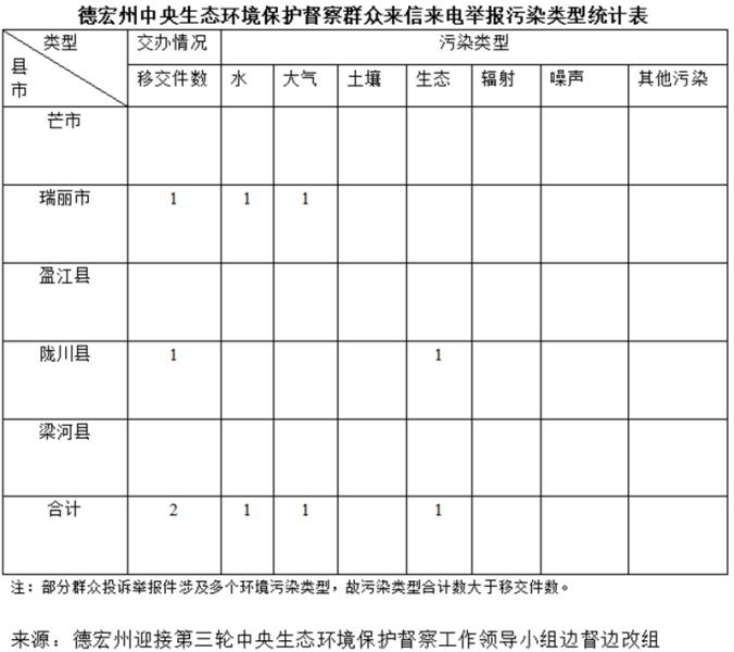 2024年5月23日,中央第七生态环境保护督察组向云南移交第十四批群众信访举报件120件,其中涉及德宏州2件。截至当日,德宏共收到中央第七生态环境保护督察组交办的信访举报件13件,所有举报件均已及时转交相关县(市)处理。