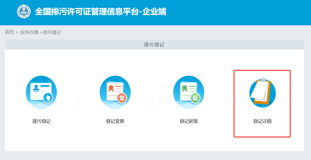 4.进入登记页面,点击“登记注销”把失效的排污登记注销。
