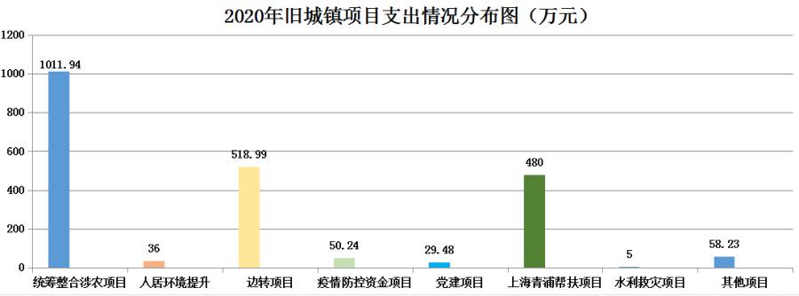 具体项目开支及开展工作情况:1.2020年统筹整合涉农项目资金支出1011.94万元,共实施了喊撒、新老抛山、麻莲山道路建设,先弄、香额湖沟渠建设,老麻撒猪舍建设,水稻烘干设备建设等14个项目;2.人居环境提升项目资金支出36万元,完成了东丙村和喊撒村两个行政村所在地无害化卫生公厕改造或新建2座; 在全镇范围内开展了农村厕所革命宣传培训,全面提高全镇农村人居环境整治水平,预期目标;3.边转项目资金支出资金518.99万元,实施了新老抛山、麻莲山道路建设;4.疫情防控资金50.24万元,用于疫情防控物资采购;5.党建项目29.48万元,修缮了旧城镇辖区内党组织党建文化墙,宣传栏等,较好的提升了基层党建的文化内涵,提高党员群众对党建文化的知晓率,夯实了党的执政根;6.上海青浦帮扶项目资金支出480万元,在旧城五和家园(易地搬迁点)新建2600平方米扶贫车间。利用新建扶贫车间产业实施“村集体+龙头企业+农户”运作模式,辐射辖区内建档立卡户,带动建档立卡户增收致富;7.水利救灾项目资金5万元,用于“7.18”洪涝灾害抢险工作支出;8.其他项目资金支出58.23万元,主要用于人民代表大会支出、新抛山中寨文化活动室建设1栋,第七次全国人口普查、旧城镇香额湖乡村旅游建设等项目支出。