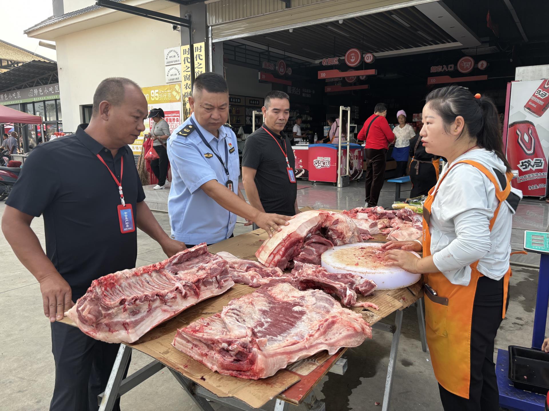 早上8点,执法队伍深入旧城周末街对8家固定摊贩和流动摊点进行了全面检查,按照《中华人民共和国食品安全法》《生猪屠宰管理条例》等相关法律法规要求,重点检查猪肉摊肉类产品来源、质量、卫生条件以及摊贩的经营地点和经营许可情况,同时,执法人员向摊主发放了市场监管告知书并现场签订《猪肉质量安全承诺书》,督促摊主认真履行食品安全主体责任,确保人民群众吃上安全肉、放心肉。