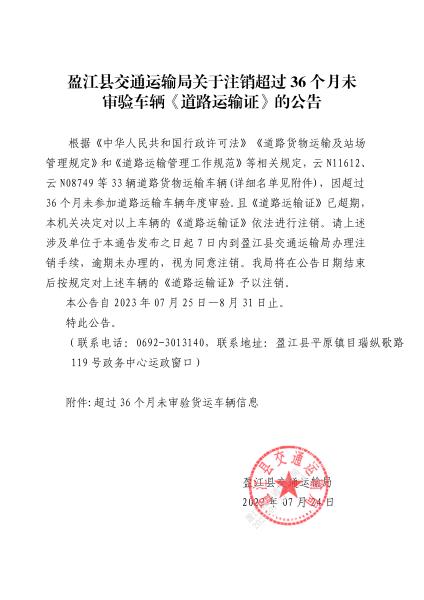 盈江县交通运输局关于注销超过36个月未审验车辆《道路运输证》的公告