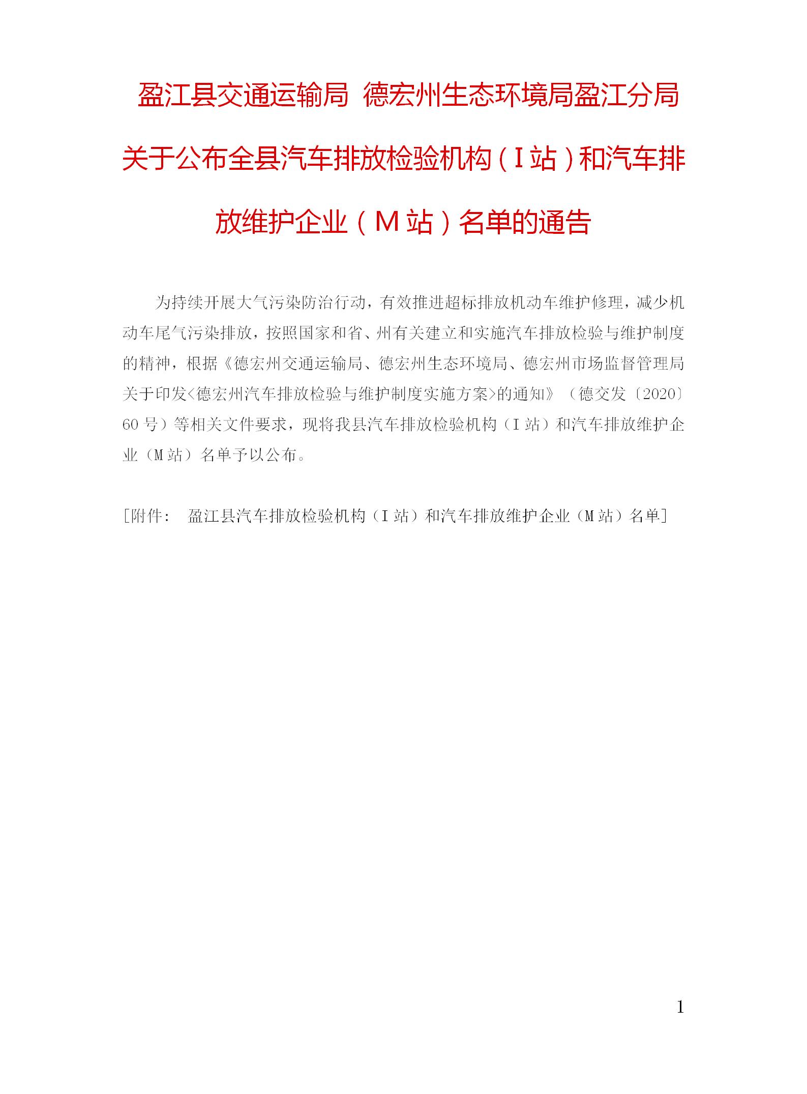 为深入贯彻落实习近平生态文明思想,持续开展大气污染防治行动,有效推进超标排放机动车维护修理,减少机动车尾气污染排放,根据<<云南省生态环境厅、云南省交通运输厅、云南省市场监督管理局关于建立实施机动车排放检验与维修制度工作的通知>>(云环通〔2020〕173号)、《德宏州交通运输局、德宏州生态环境局、德宏州市场监督管理局关于印发<德宏州汽车排放检验与维护制度实施方案>的通知》(德交发〔2020〕60号)等相关文件要求,推进我县机动车尾气排放治理,2023年12月10日全县试运行机动车排放检验与维修制度闭环管理。现将相关规定通告如下: