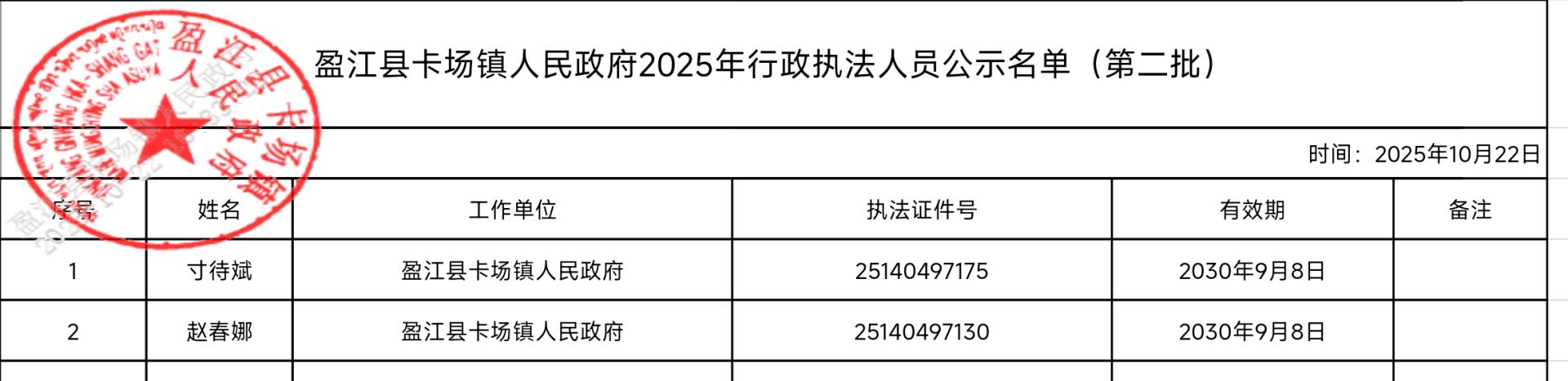 盈江县卡场镇人民政府2025年行政执法人员公示名单(第二批)