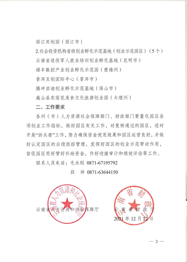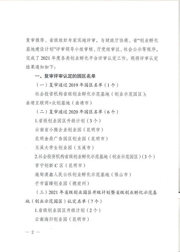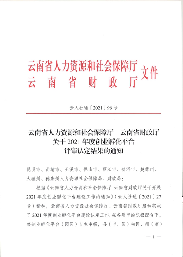 云南省人力资源和社会保障厅 云南省财政厅 关于2021年度创业孵化平台评审认定结果的通知