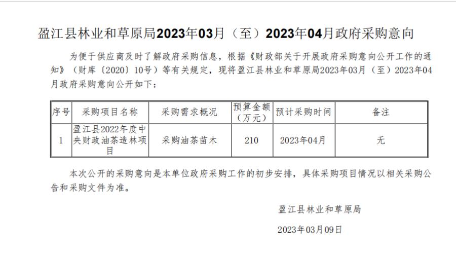 盈江县林业和草原局2023年04月(至)2023年04月政府采购意向