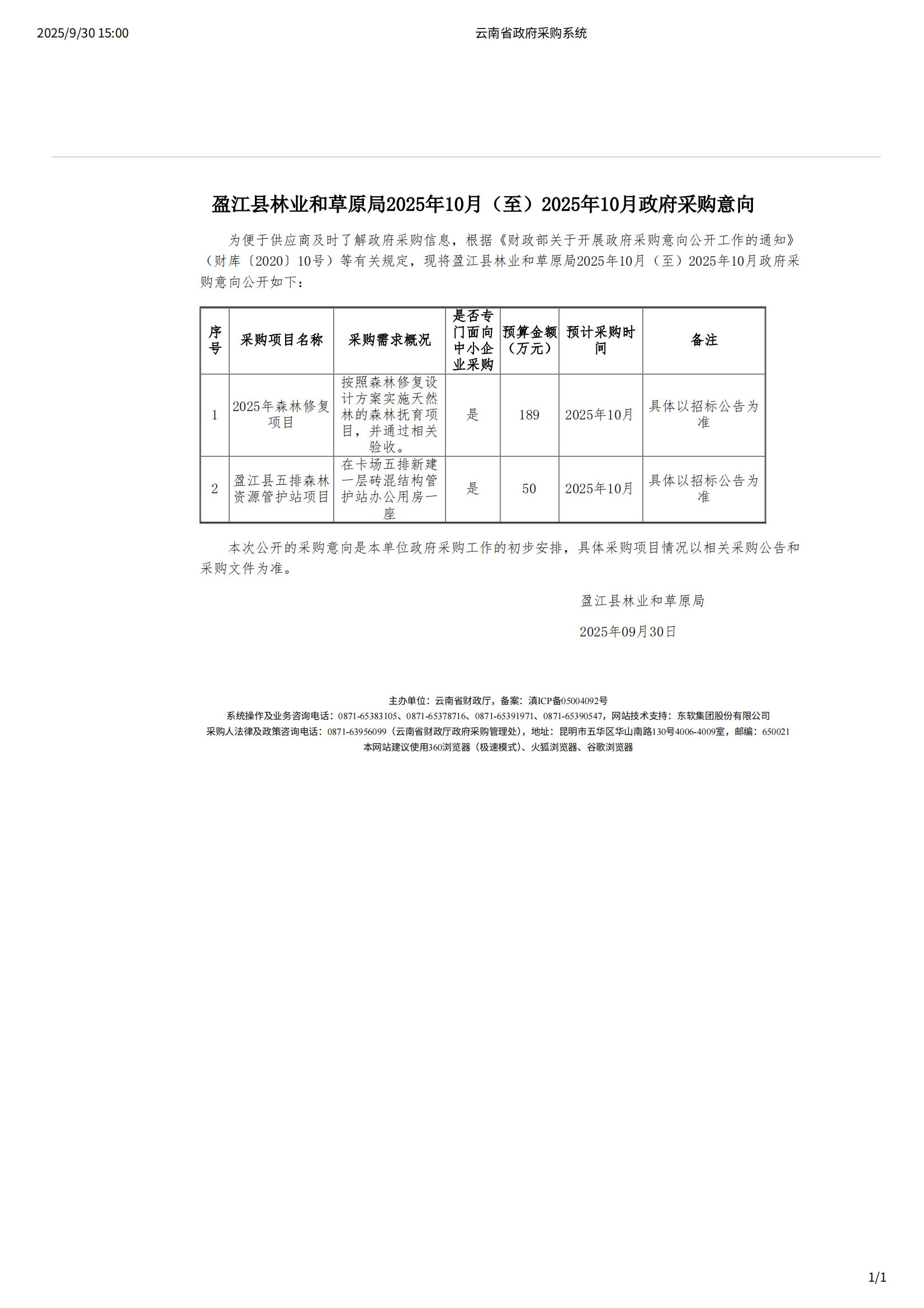 盈江县林业和草原局2025年10月(至)2025年10月政府采购意向