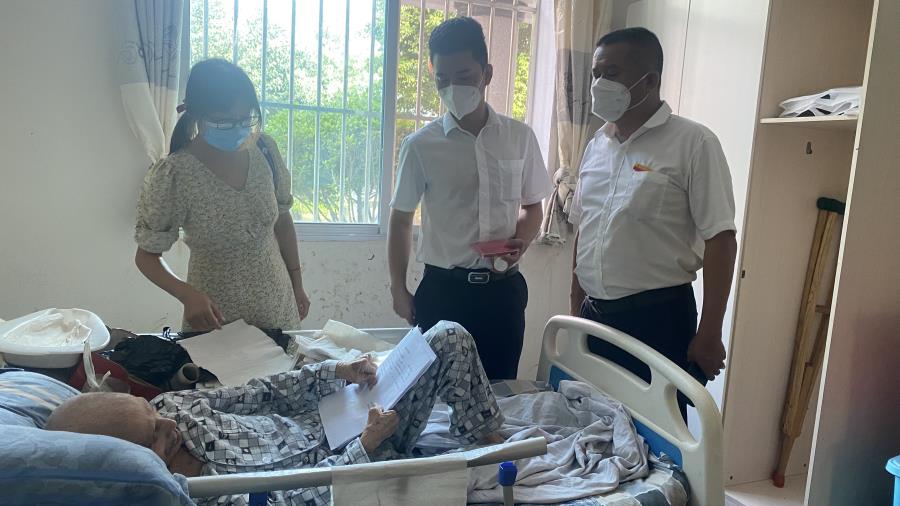 盈江县太平敬老院院工作人员把供养对象办理社保卡遇到困难的情况向盈江农商行太平支行的领导反映,盈江县农商行太平支行领导高度重视,立即安排工作人员提前做好核酸采集检测,于2022年7月2日下午携带相关工作设备、佩戴好口罩到盈江县太平敬老院内提供上门服务。
