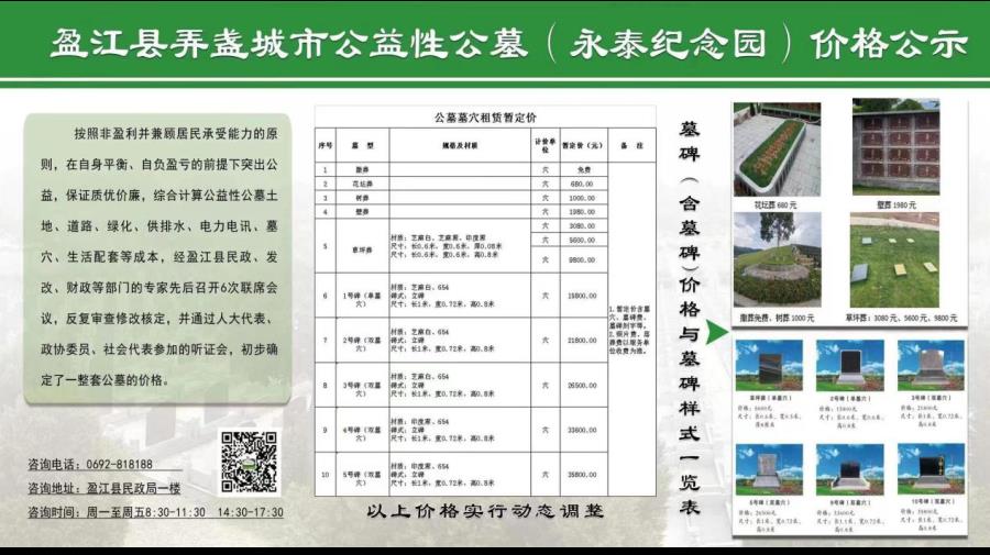 盈江县弄盏城市公益性公墓的价格经县民政、财政、发改三部门六轮部门联席会议审查后通过,突出公益属性,价格分为十个档次,最低的一个档次为撒葬(免费),节地生态葬由几百元阶梯式上升至千元,墓碑葬分为几千元到一万多元的经济型,两万多元到三万多元的普通型,可以满足社会民众不同层次的需求。弄盏城市公益性公墓与周边县市同类产品服务在价格上具有比较优势。