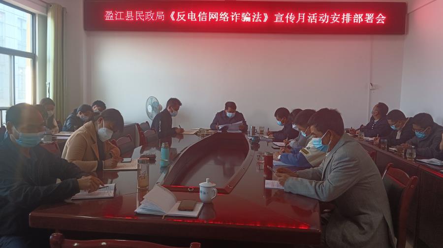 根据中共盈江县委网络安全和信息化委员会办公室、盈江县互联网信息办公室关于转发《关于做好<中华人民共和国反电信网络诈骗法>网上宣传工作的通知》要求,盈江县民政局高度重视,在前期已提前进行学习的情况下,于2022年12月12日上午9时进行“盈江县民政局《中华人民共和国反电信网络诈骗法》宣传月部署会”。