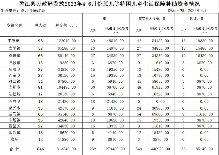 盈江县民政局发放2023年1-6月份孤儿等特困儿童生活保障补助资金情况