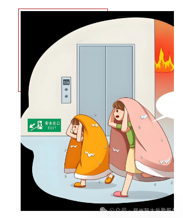 逃离火灾现场时,要沿着标有“安全出口”的通道逃生,高楼逃生时要使用楼梯,切忌使用电梯逃生。楼梯通道、安全出口等应该保证通畅无阻,切不可堆放杂物或设闸上锁。