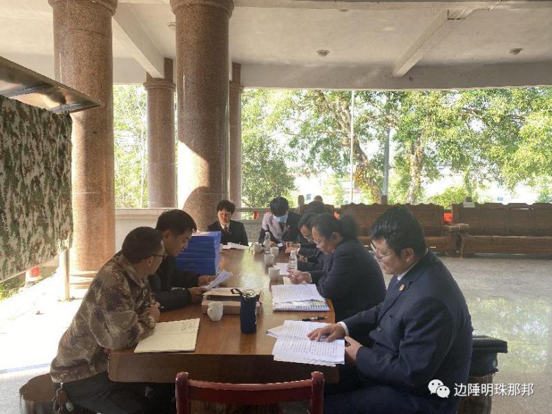 会后,工作组先后实地走访了那邦村委会“普法”阵地、那邦镇党建长廊三级联防等地,了解了那邦村普法工作、联防所联防联控运行、突发事件应急处置、物防技防设施日常维护、巡逻值守、打击跨境违法犯罪活动等情况,本着求实效原则,针对村级“普法、强基、补短板”专项行动工作方式方法,工作组和镇村干部、联防员进行了讨论沟通。
