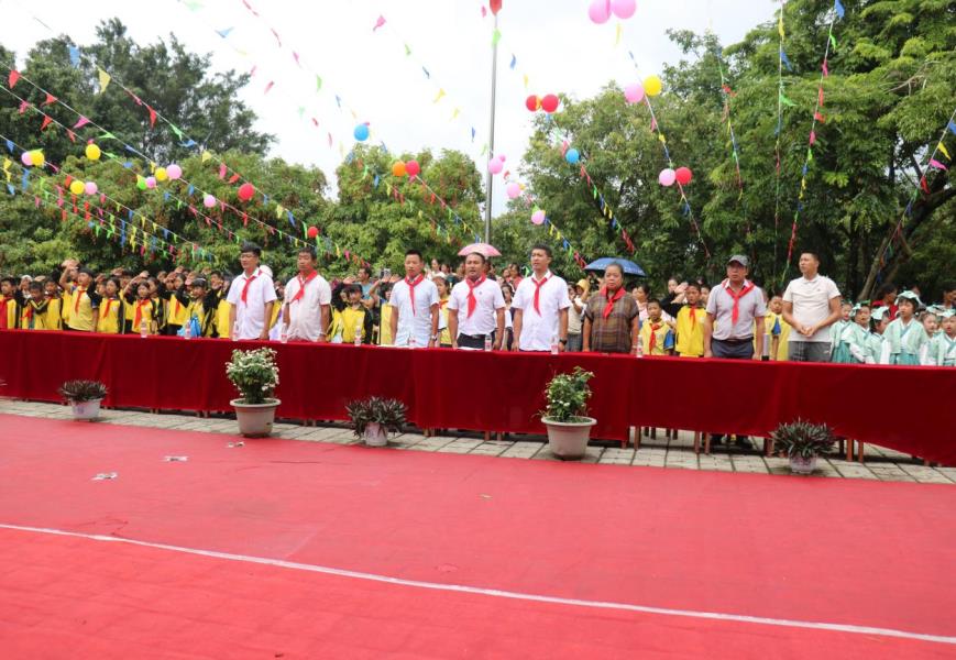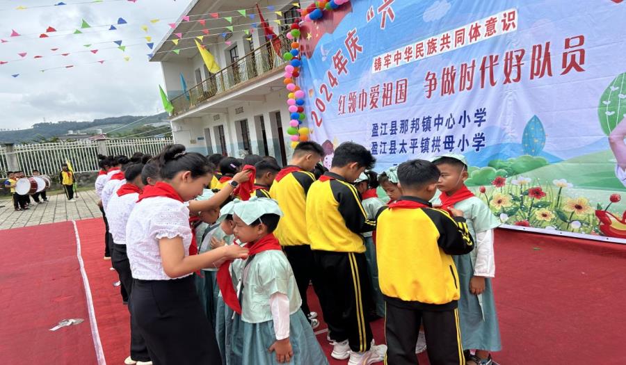 伴随着庄严有力的出旗曲,旗手们昂首挺胸、精神抖擞,迈着整齐的步伐,高举队旗入场。全体队员齐唱《中国少年先锋队队歌》,学校老师及老队员们为新入队的同学佩戴红领巾,新老队员们高举右拳宣誓入队。此次,那邦镇中心小学共22余同学新加入少先队组织。