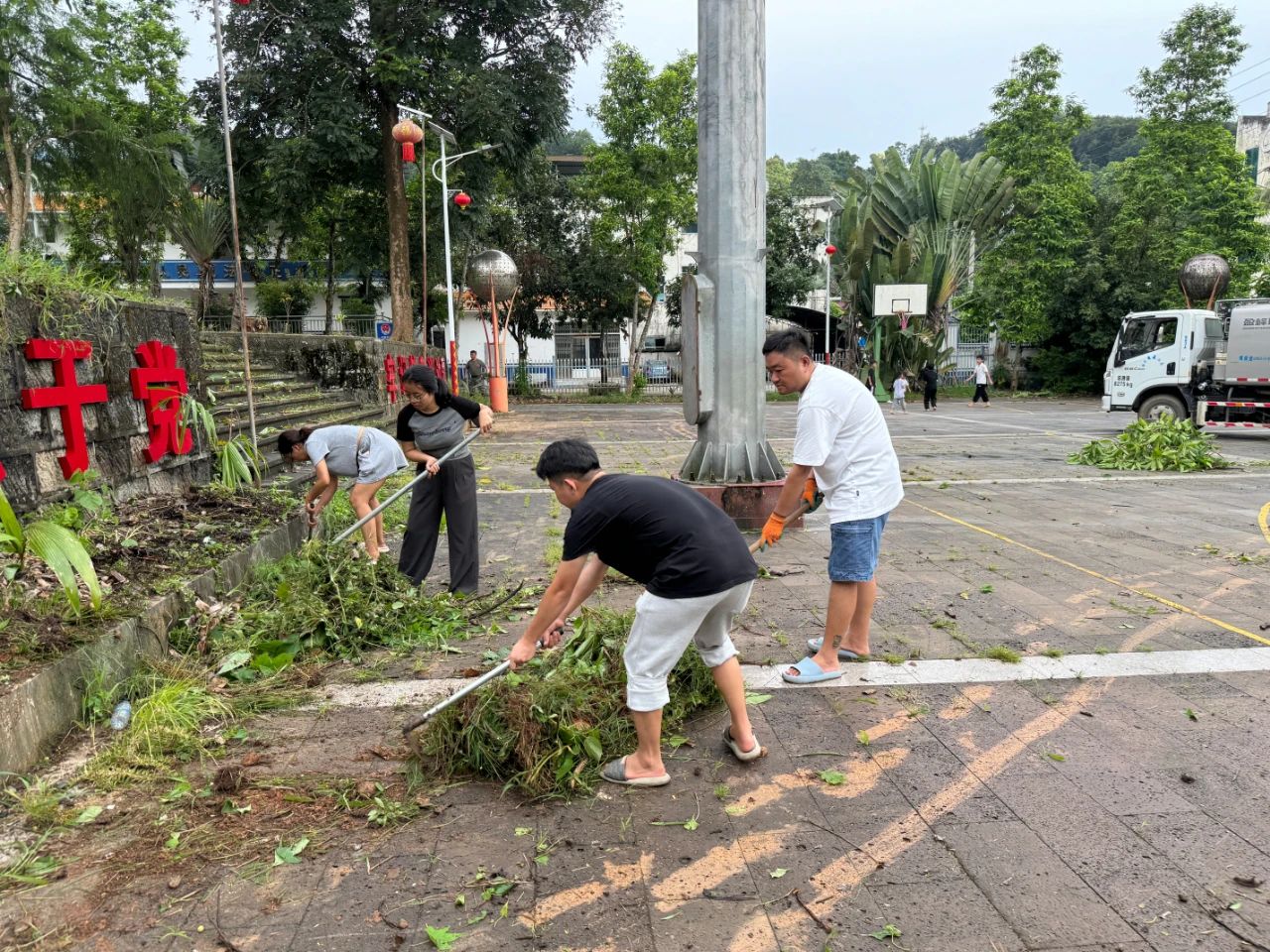 全体镇村党员干部扛起锄头、拿起扫帚,清除杂草,修整干枯树枝,对乱堆乱放、乱拉乱挂、乱泼乱倒等现象进行清理。此次活动共出动清运车辆1台,清理垃圾、杂草、树枝杂物等3吨,处理房前屋后堆放物10处。