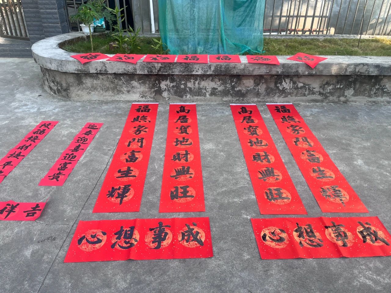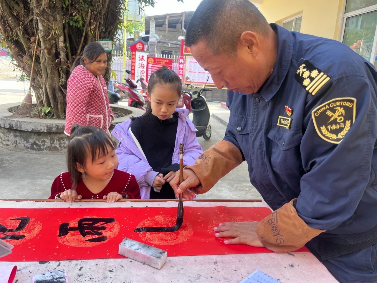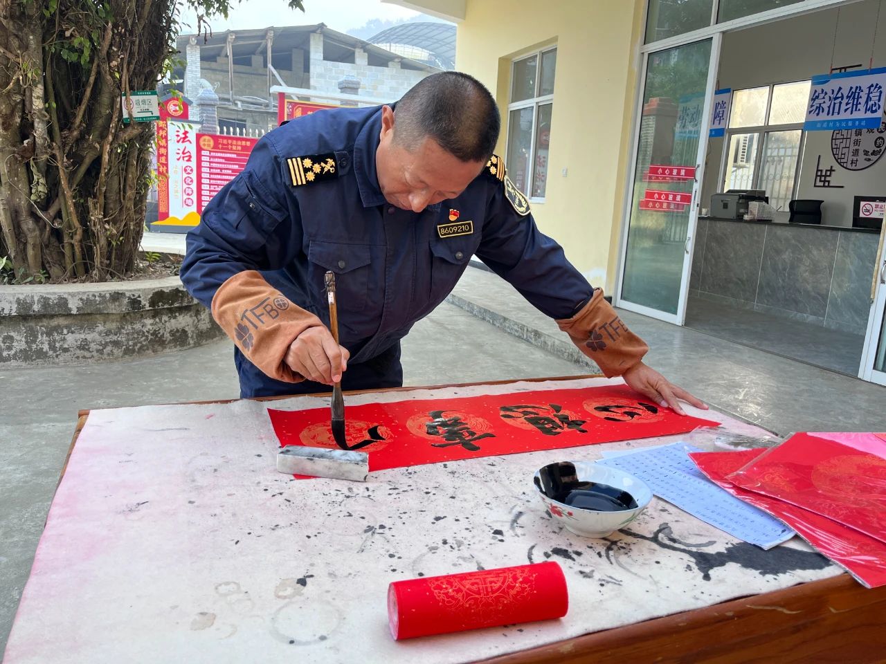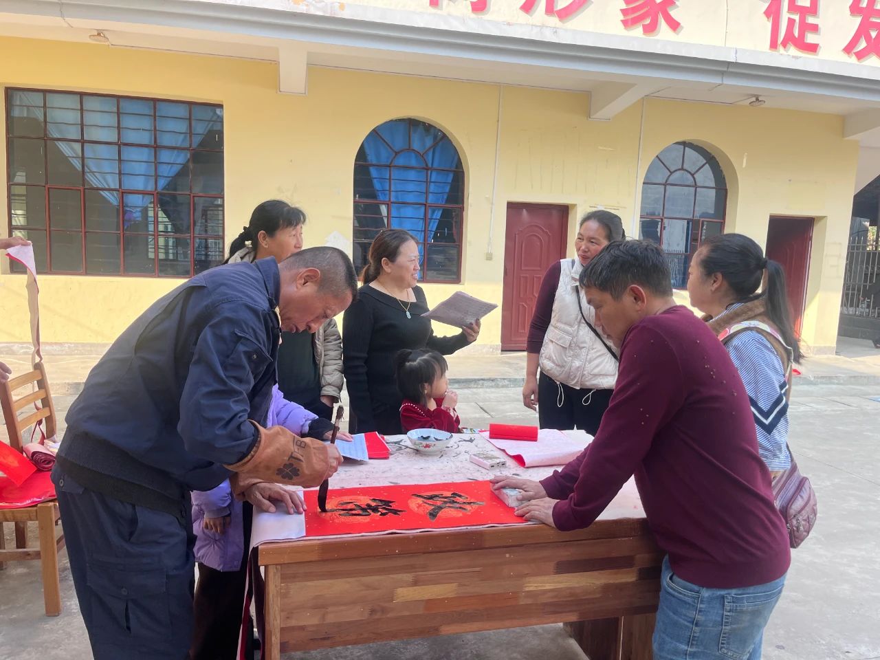 活动现场,热闹非凡。街道村两委成员、驻村工作队早早地来到现场,摆开桌椅,准备好笔墨纸砚。驻村第一书记胡家卫是一名书法爱好者,他饱含创作热情,挥毫泼墨,一幅幅散发着清新墨香的大红春联和福字跃然纸上。字体或苍劲有力,或飘逸灵动,风格各异,“一帆风顺吉星到,万事如意福临门”“喜居宝地千年旺,福照家门万事兴”等寓意吉祥的对联,寄托了村两委成员、驻村工作队对居民们新年的美好祝福。