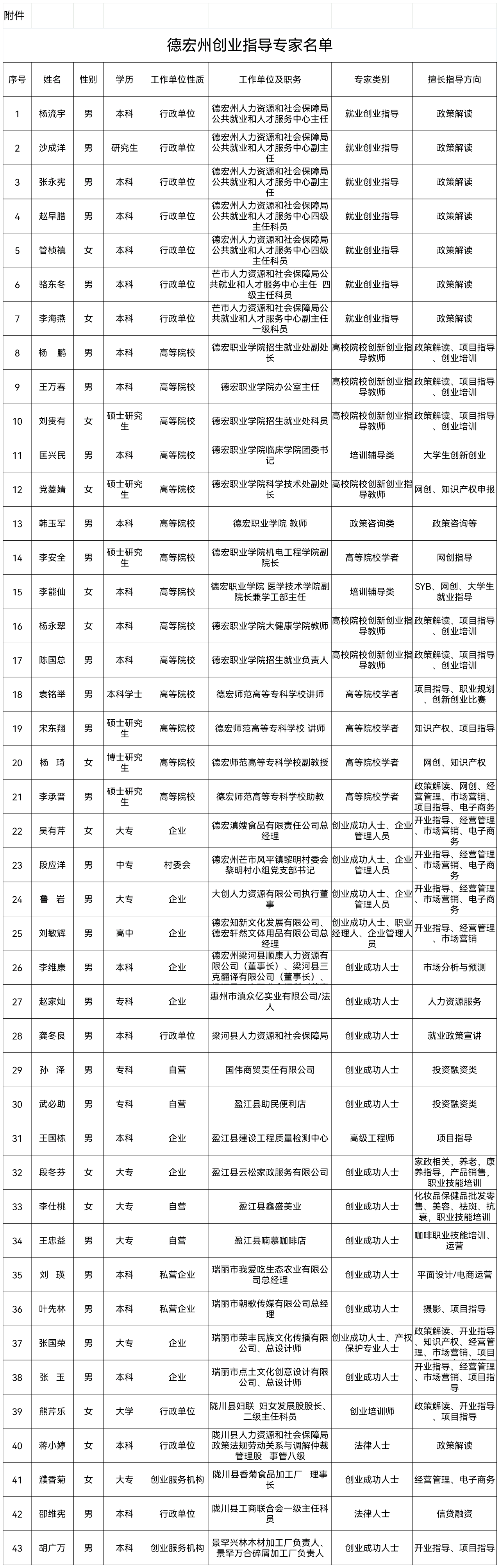 为进一步优化全州创业指导团队,全面提升创业服务水平,发挥创业指导专家在新形势下推动创新创业工作中的积极作用,根据《德宏州人力资源和社会保障局关于选聘创业指导专家的通知》文件,采取“自愿报名、选拔推荐、择优聘任”的程序,选聘杨流宇等43名专家为创业指导专家,聘期三年,现予以公布。