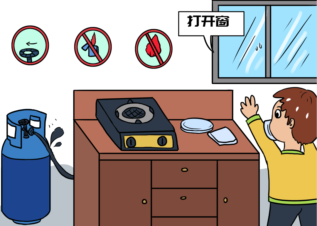 9.如果燃气罐着火,要用浸湿的被褥、衣物等捂盖或灭火器灭火,明火熄灭后,关闭阀门。