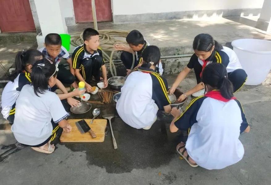 中午时分,几缕炊烟从盈江县弄璋镇成人技术学校的烟囱缓缓升空。院内,弄璋镇中心完小的40余名高年级学生,从劈柴烧火、洗菜切菜到煮饭炒菜,一双双不同民族的小手共同为今日的午餐忙前忙后。6年级的汉族学生杨再娅和傣族学生丘雨彤跟随老师来此已经两天,在一个星期的时间中,她们要从农作物种植、收拾床铺、自己洗衣做饭开始,当一回“小大人”。