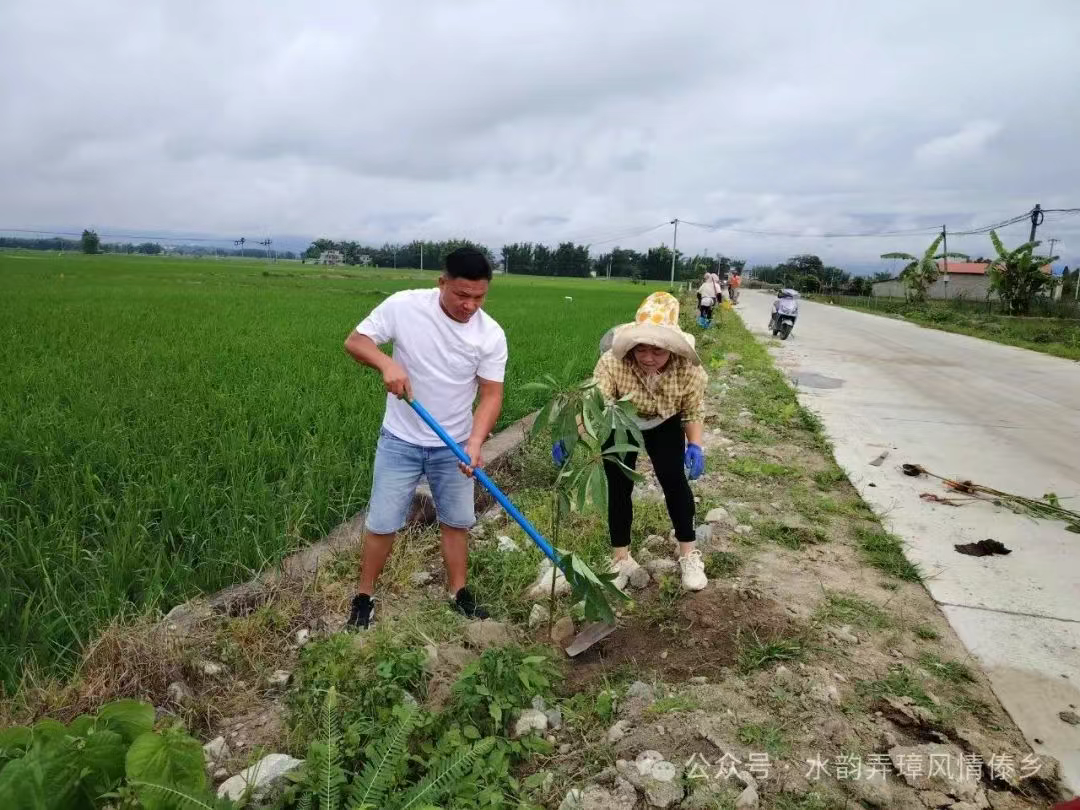 面对路边、田间地头闲散,难以规模化利用的土地,南算村党支部以行动破局。活动现场,32名党员分组协作——老党员带头示范培土技巧,年轻党员精准测量树苗间距,汗水浸透的红马褂与翠绿幼苗相映成趣。“种树最好的时间是十年前,其次是现在!”村支书徐焕娣边夯土边感慨,“木棉成林时,这里就是村民共享的生态家园。”