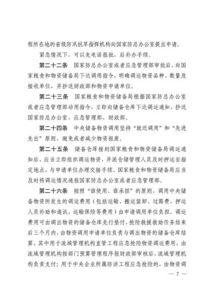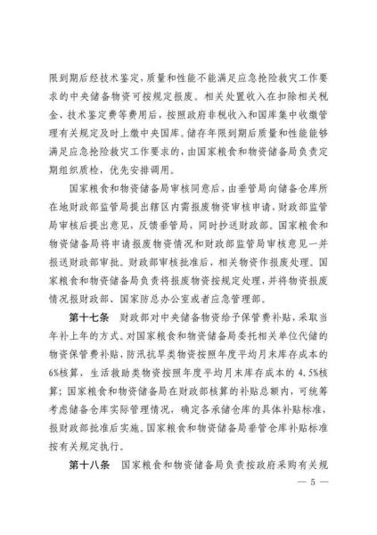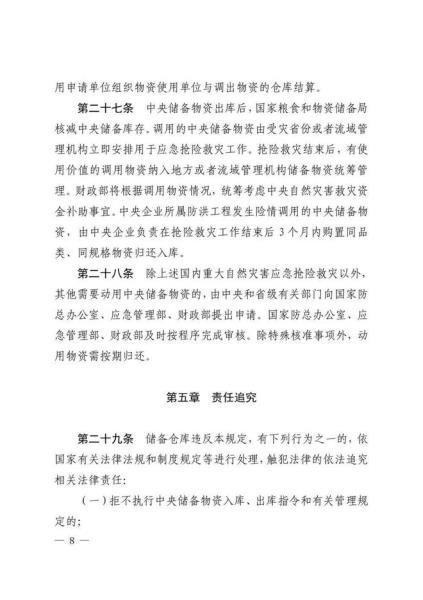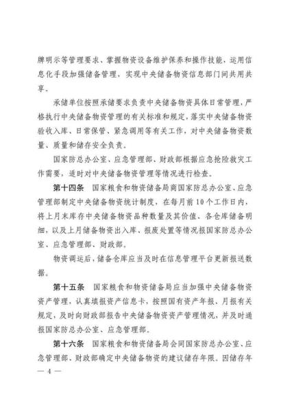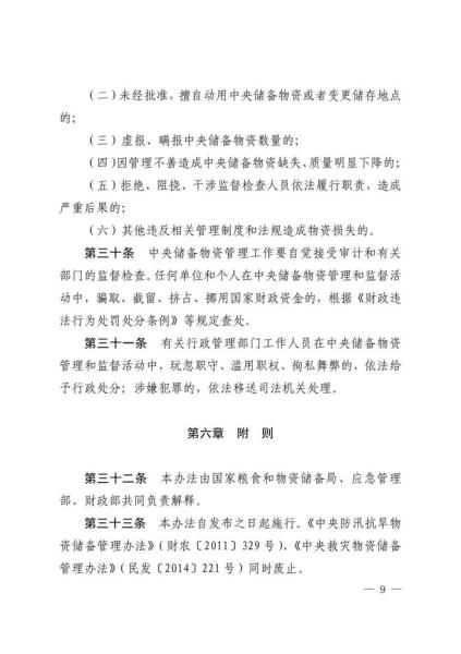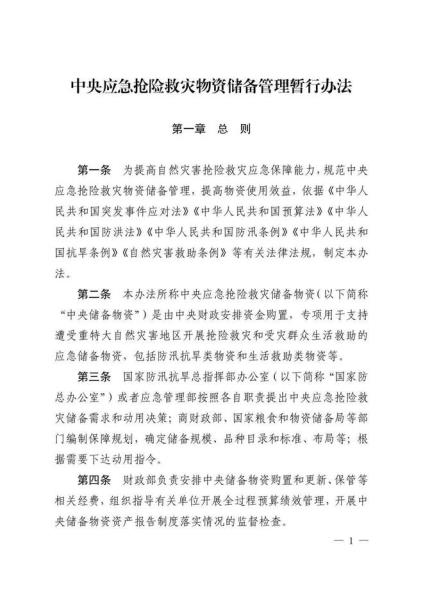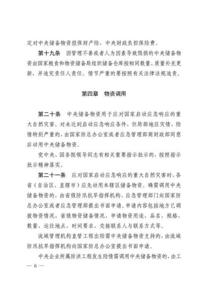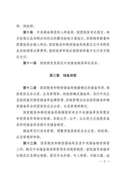 日前,国家粮食和物资储备局、应急管理部、财政部联合印发《中央应急抢险救灾物资储备管理暂行办法》。《暂行办法》共6章33条,分章对各方职责、储备购置、储备保管、物资调用、监督检查、责任追究等作了规定。