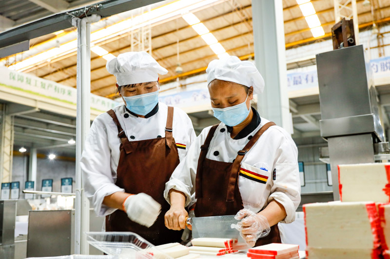 5月14日,在重庆市涪陵区美心红酒小镇景区扶贫车间里,一名技师手把手地指导贫困户李晓红(右)加工食品。为助力脱贫攻坚,美心红酒小镇景区结合自身旅游人气优势,将闲置厂房改造成扶贫车间。扶贫车间在采买贫困户和周边村民榨菜、土豆等农副产品进行消费扶贫的同时,还优先招收困难群众、贫困户进入车间从事食品加工生产工作,带动景区周边100余户贫困户和困难群众家庭实现增收。新华社记者 刘潺 摄