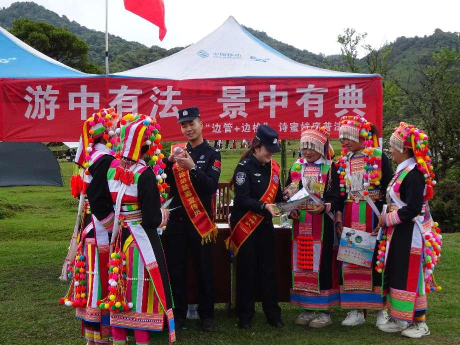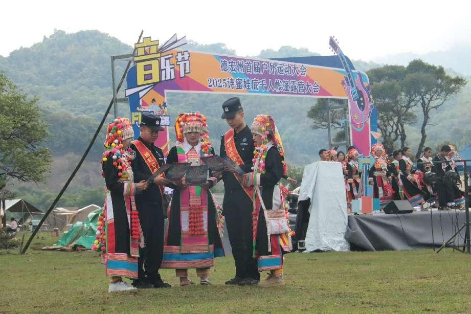2025年5月2日至3日,诗蜜娃底千人露营活动在盈江县苏典乡举行。为进一步增强群众法治意识,营造欢乐祥和、平安稳定的节日氛围,苏典边境派出所联合苏典分站走进千人露营活动现场,打造“傈僳语+汉语”沉浸式普法新场景,将反诈、涉枪、涉爆禁毒等法律知识融入露营活动现场,为千余名群众送上法治“大礼包”。