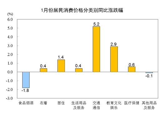 1月份,食品烟酒类价格同比下降1.8%,影响CPI(居民消费价格指数)下降约0.52个百分点。食品中,畜肉类价格下降25.6%,影响CPI下降约1.11个百分点,其中猪肉价格下降41.6%,影响CPI下降约0.96个百分点;鲜菜价格下降4.1%,影响CPI下降约0.10个百分点;鲜果价格上涨9.9%,影响CPI上涨约0.19个百分点;水产品价格上涨8.8%,影响CPI上涨约0.16个百分点;蛋类价格上涨1.9%,影响CPI上涨约0.01个百分点;粮食价格上涨1.6%,影响CPI上涨约0.03个百分点。