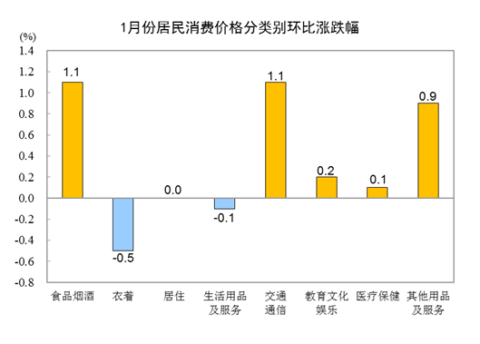 1月份,食品烟酒类价格环比上涨1.1%,影响CPI上涨约0.30个百分点。食品中,鲜果价格上涨7.2%,影响CPI上涨约0.14个百分点;水产品价格上涨4.1%,影响CPI上涨约0.08个百分点;鲜菜价格上涨3.1%,影响CPI上涨约0.07个百分点;蛋类价格下降1.1%,影响CPI下降约0.01个百分点;畜肉类价格下降0.8%,影响CPI下降约0.03个百分点,其中猪肉价格下降2.5%,影响CPI下降约0.04个百分点。