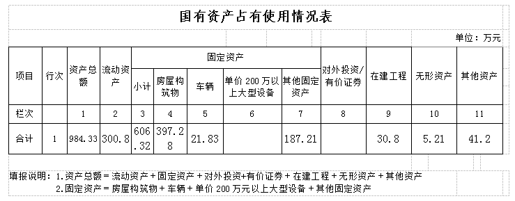 截至2019年12月31日,盈江县弄璋镇中心卫生院资产总额984.33万元,其中,流动资产300.8万元,固定资产606.32万元,对外投资及有价证券0万元,在建工程30.8万元,无形资产5.21万元,其他资产41.2万元(具体内容详见附表)。与上年相比,本年资产总额减少492.21万元,其中;固定资产减少170.68万元。处置房屋建筑物0平方米,账面原值0万元;处置车辆0辆,账面原值0万元;报废报损资产0项,账面原值0万元,实现资产处置收入0万元;出租房屋0平方米,账面原值0万元,实现资产使用收入0万元。