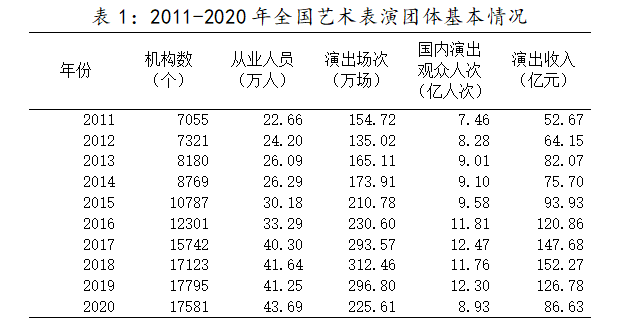 2020年末,全国共有艺术表演团体17581个,比上年末减少214个;从业人员43.69万人,增加2.44万人。其中各级文化和旅游部门所属艺术表演团体2060个,占11.7%,从业人员10.75万人,占24.6%。