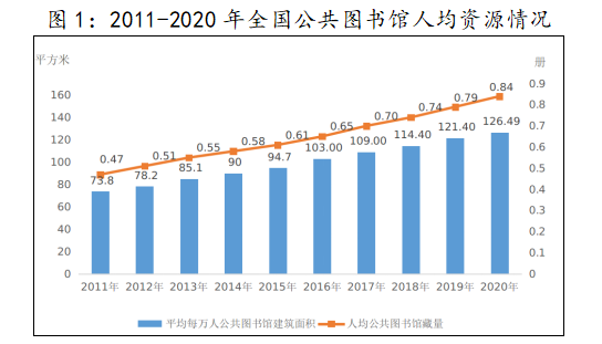 2020年末,全国平均每万人公共图书馆建筑面积126.49平方米,比上年末增加5.09平方米,全国人均图书藏量0.84册,增加0.05册;全年全国人均购书费1.60元,减少0.08元。
