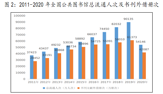 全年公共图书馆发放借书证10251.31万个,比上年增长18.8%;总流通人次54145.81万,比上年下降39.9%;书刊文献外借42087.15万册次,下降31.4%;外借人次17466.62万,下降34.4%。全年共为读者举办各种活动150713次,比上年下降23.0%;参加人次9279.33万,下降21.3%。
