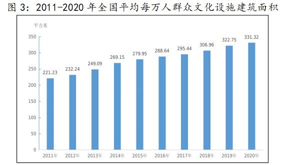 2020年末,全国群众文化机构实际使用房屋建筑面积4677.45万平方米,比上年末增长3.5%;业务用房面积3387.89万平方米,增长2.8%。年末全国平均每万人民群众文化设施建筑面积331.32平方米,增长2.67%。