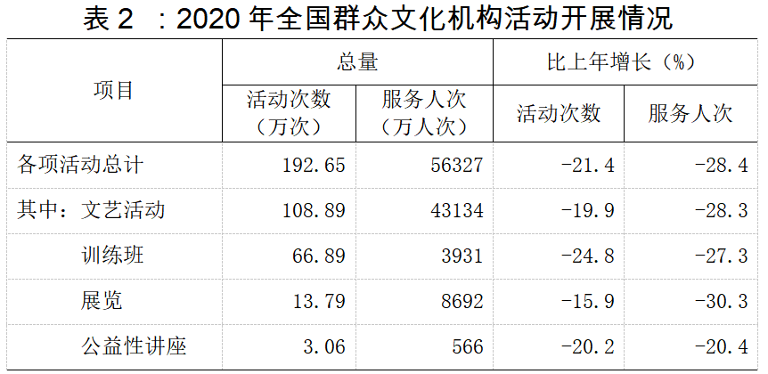 全年全国群众文化机构共组织开展各类文化活动192.65万场次,比上年下降21.4%;服务人次56327.04万人次,下降28.4%。