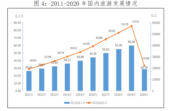 2020年,全年国内旅游人数28.79亿人次,比上年同期下降52.1%。国内旅游收入2.23万亿元,同比下降61.1%。